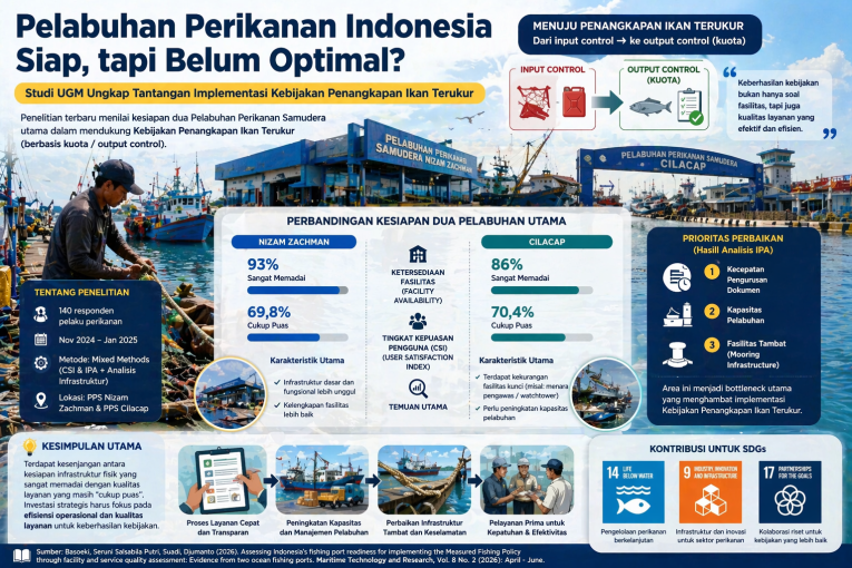 Sebuah studi terbaru yang dipublikasikan dalam jurnal Maritime Technology and Research mengungkap fakta menarik tentang kesiapan pelabuhan perikanan Indonesia dalam mendukung implementasi Kebijakan Penangkapan Ikan Terukur. Penelitian ini dilakukan oleh Basoeki, Seruni Salsabila Putri, (alumni Departemen Perikanan UGM) serta dua akademisi dari Universitas Gadjah Mada, yaitu Prof. Suadi dan Prof. Djumanto.
