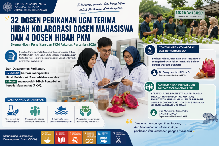 Yogyakarta – Prestasi membanggakan diraih sivitas akademika Departemen Perikanan Fakultas Pertanian Universitas Gadjah Mada. Sebanyak 32 dosen berhasil memperoleh pendanaan Hibah Kolaborasi Dosen–Mahasiswa, sementara 4 dosen lainnya menerima Hibah Pengabdian kepada Masyarakat (PKM) dalam skema Hibah Penelitian dan PKM Fakultas Pertanian Tahun 2026.