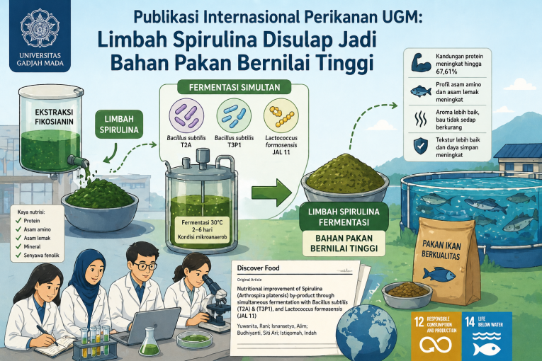 Penelitian berjudul “Nutritional improvement of Spirulina (Arthrospira platensis) by-product through simultaneous fermentation with Bacillus subtilis (T2A) & (T3P1), and Lactococcus formosensis (JAL 11)” ini ditulis oleh Dr. Rani Yuwanita, Prof. Alim Isnansetyo, Dr. Siti Ari Budhiyanti, serta Dr. Indah Istiqomah. Dr Rani sendiri merupakan dosen Universitas Brawijaya yang baru saja menyelesaikan pendidikan Doktor di Departemen Perikanan UGM.