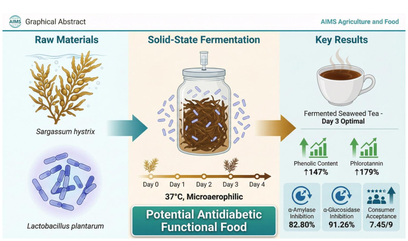 Riset ini mengangkat potensi rumput laut cokelat Sargassum hystrix sebagai bahan baku teh fungsional dengan aktivitas antidiabetes. Kandungan senyawa bioaktif seperti fenol dan florotanin diketahui memiliki kemampuan menghambat enzim yang berperan dalam peningkatan kadar gula darah. Namun, pemanfaatannya selama ini terkendala oleh stabilitas senyawa aktif serta aroma amis yang menurunkan tingkat penerimaan konsumen.